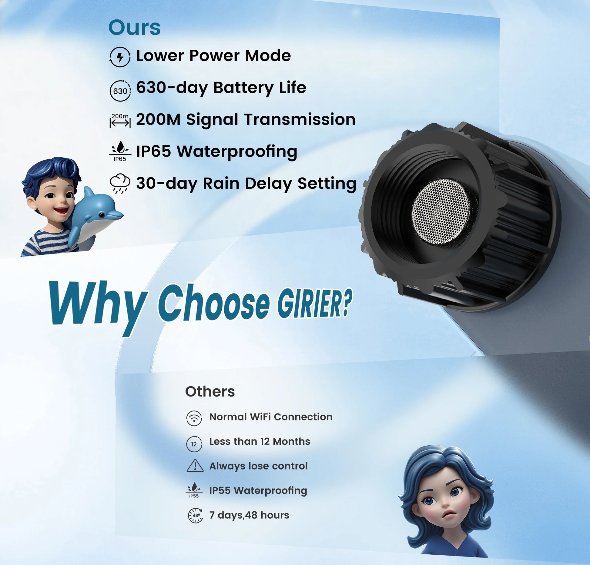 GIRIER's water timer boasts a lower power consumption mode, eliminating the need for additional hubs or repeaters. This ensures a stable and powerful Wi-Fi connection, allowing you to enjoy seamless control over your irrigation system. With GIRIER, you can confidently water your garden knowing that your system is both responsive and reliable.