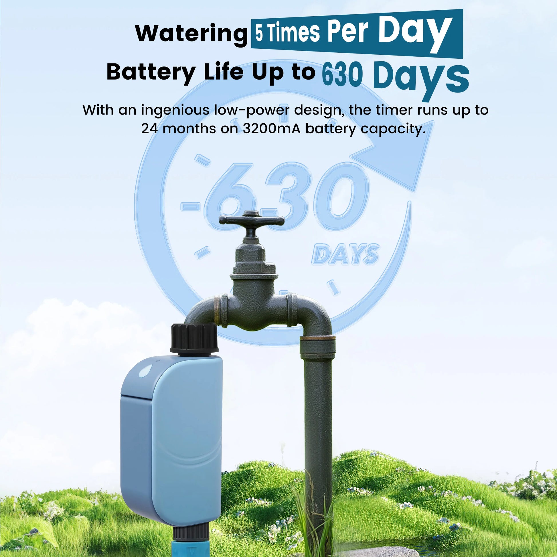 Made to save every drop, our timer lasts up to 630 days (based on 5 cycles/day in lab conditions) — enjoy watering that just works. Rain or shine, home or away-your garden stays perfectly watered , no constant battery swaps needed.